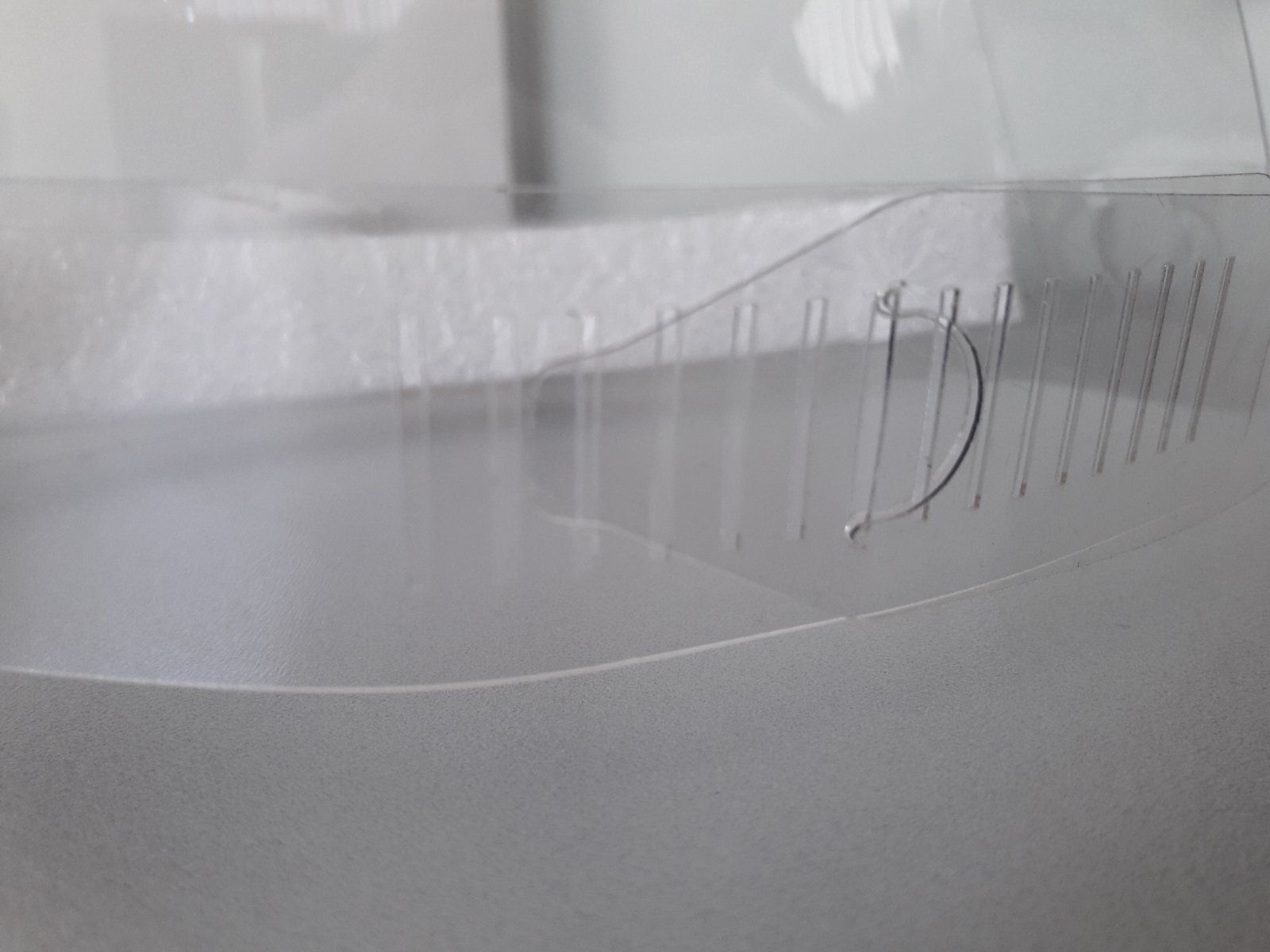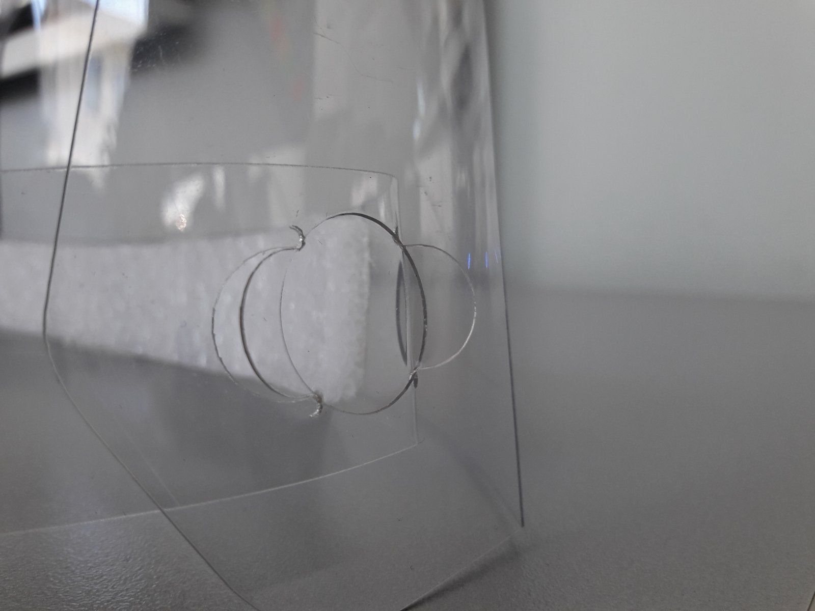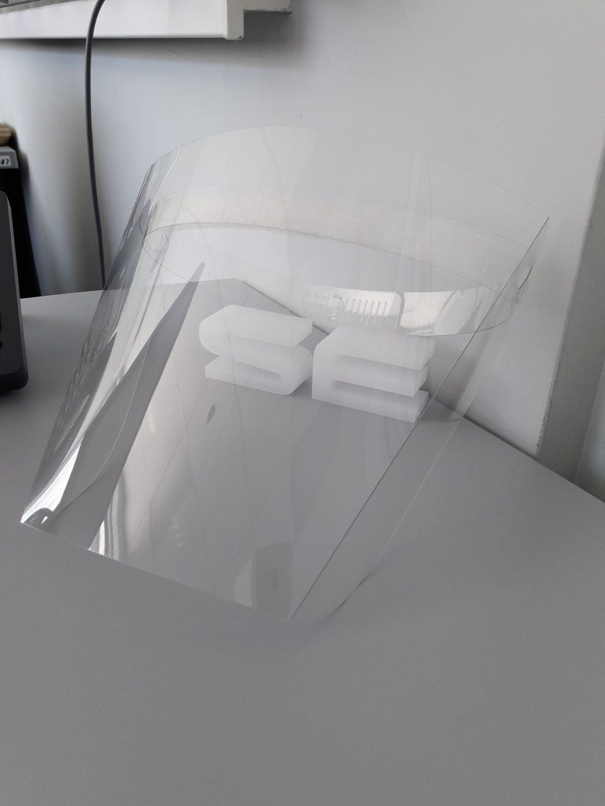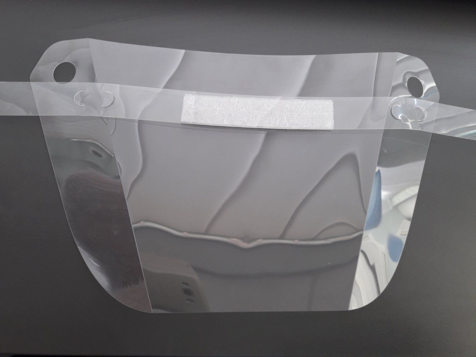 2. Prefabricated shield in two parts made of plastic only: transparent, flexible, unbreakable, reusable, can be cleaned and disinfected